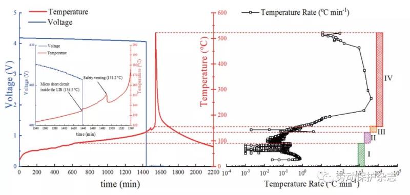 圖1 三元鋰離子電池?zé)崾Э剡^程中溫度、電壓變化