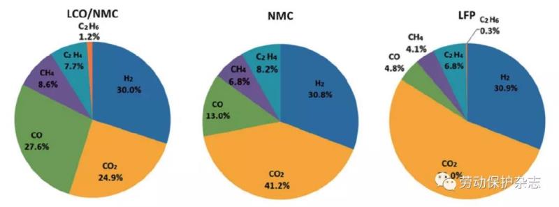 電池?zé)崾Э禺a(chǎn)生的一些氣體除了具有可燃性之外,還具有危害很高的毒性,如CO、HF(氟化氫)等。不同體系的電池在熱失控時產(chǎn)生的氣體成分及占比如圖2所示。